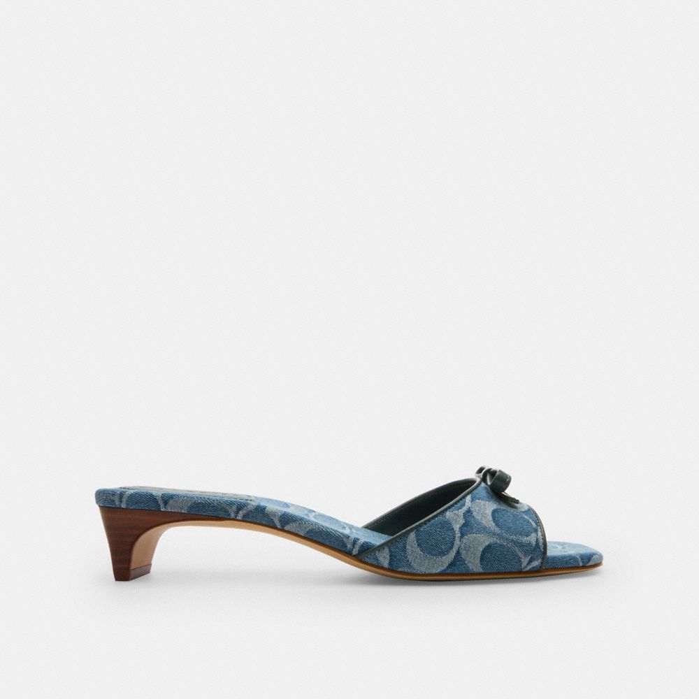 COACH®,Bow Kitten Heel Sandal In Signature Denim,Rubber,Leather,Cotton,Slides,Logo,Bow,Day Party,Blue,Front View
