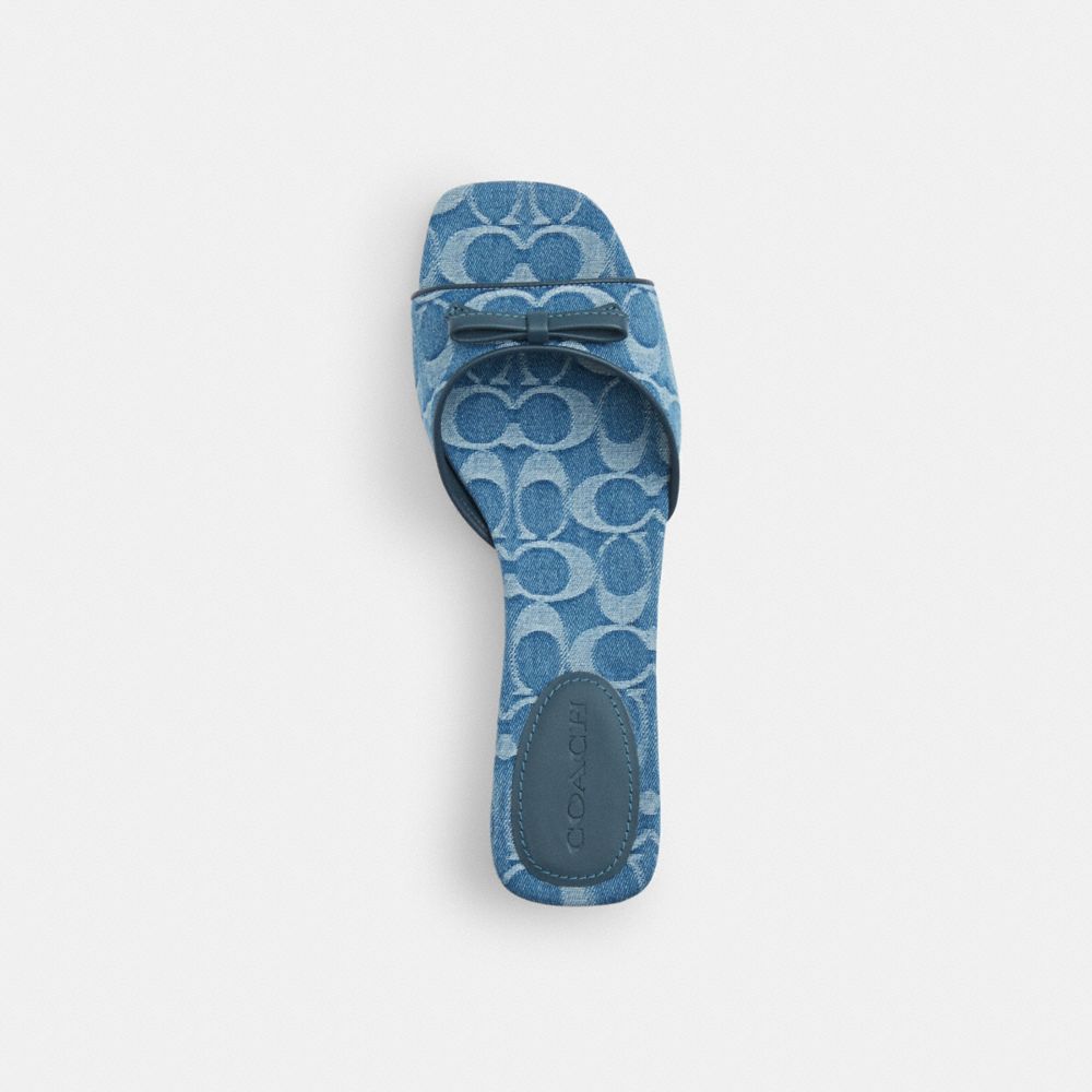 COACH®,Bow Kitten Heel Sandal In Signature Denim,Rubber,Leather,Cotton,Slides,Logo,Bow,Day Party,Blue,Inside View,Top View