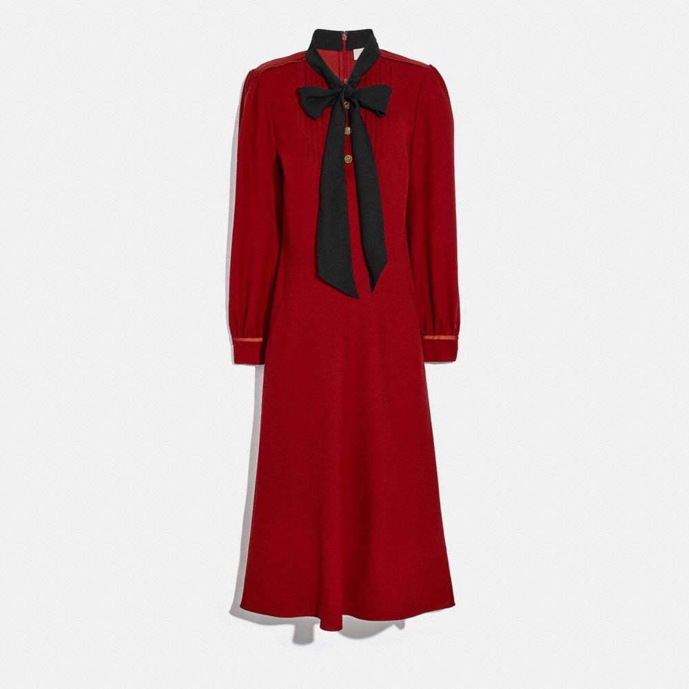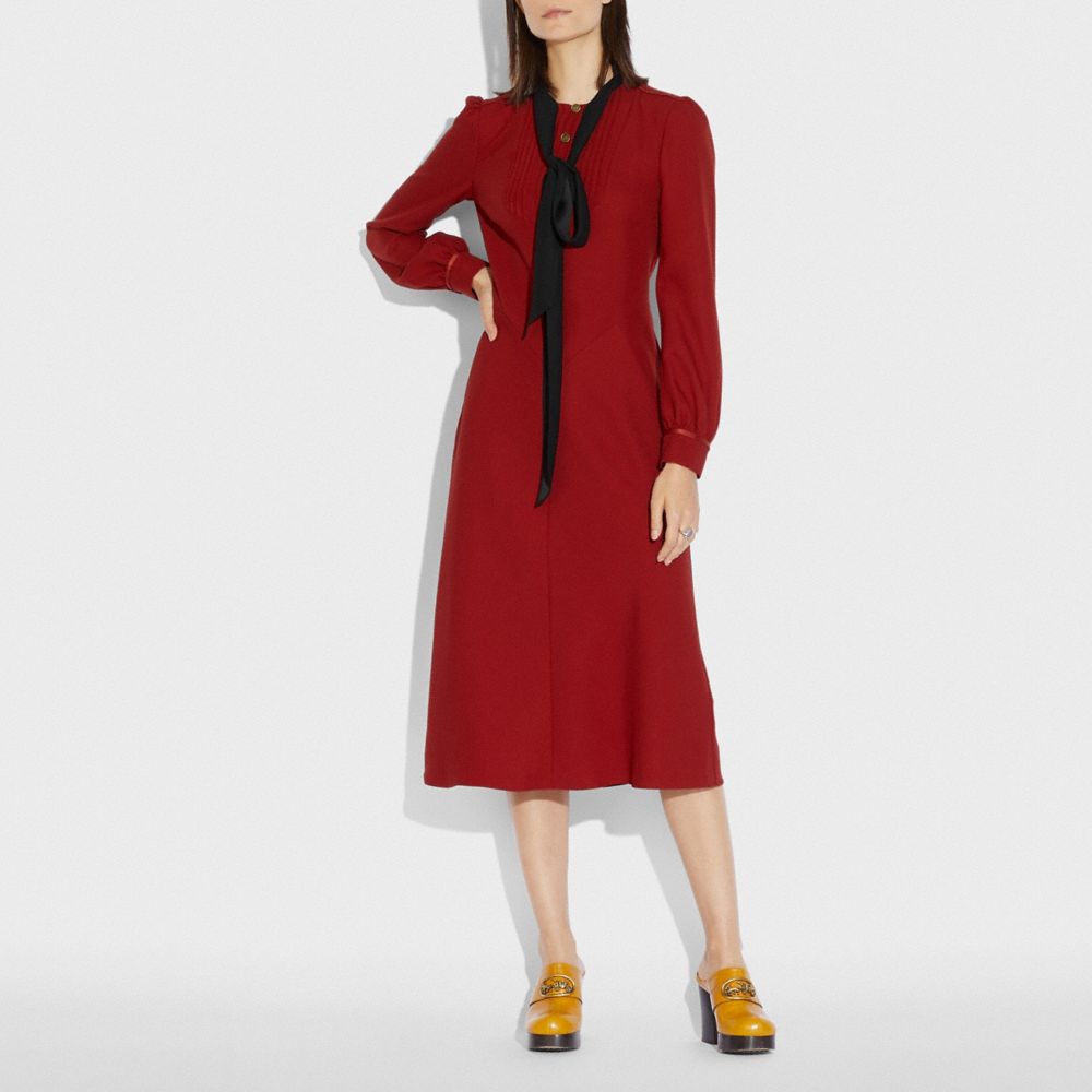 A vintage-inspired silhouette, this sophisticated midi dress features a slim-fit bodice and voluminous blouson sleeves. The slightly A-line style is finished with a pleated bib and long neck tie to wear undone, as a relaxed knot or a voluminous bow.