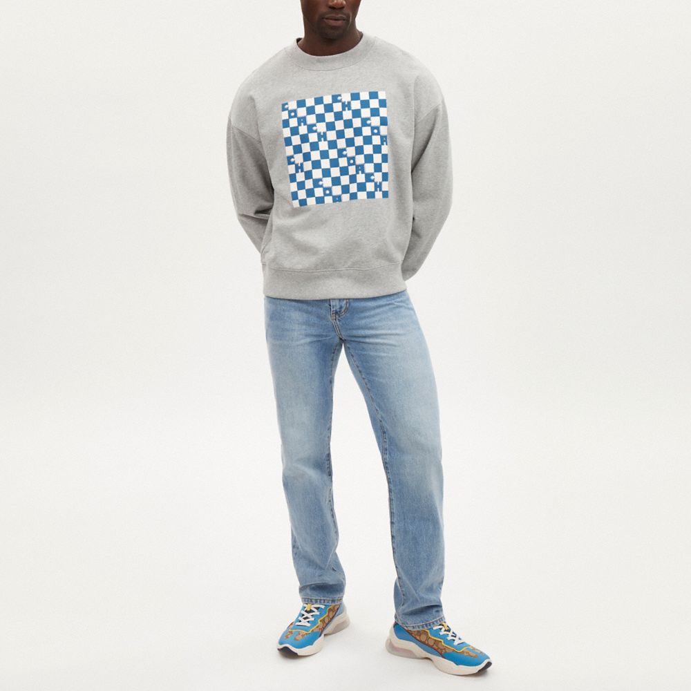 COACH®,Checkerboard Crewneck Sweatshirt,Cotton,Sweatshirt,Logo,Pattern,Casual,Gray,Front View