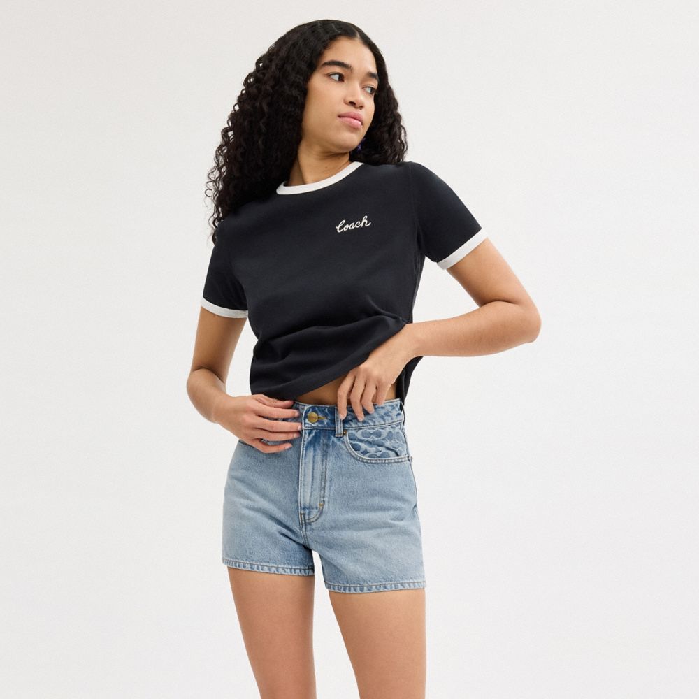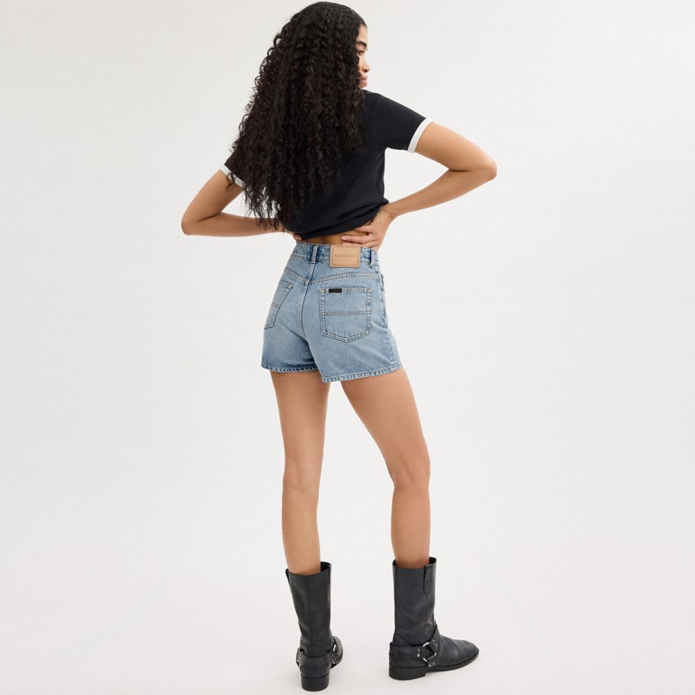 A modern take on a ‘90s silhouette, these classic-fit jean shorts are crafted of organic cotton denim made without the use of harmful chemical fertilizers and pesticides. Detailed with our Signature at the pockets, the high-waisted design is finished with a leather patch and our Coach flag at the back for a heritage touch.