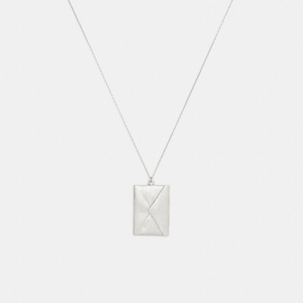 You’ve got mail. This long chain necklace features a polished envelope pendant with an engraved note. It’s finished with a lobster clasp closure.
