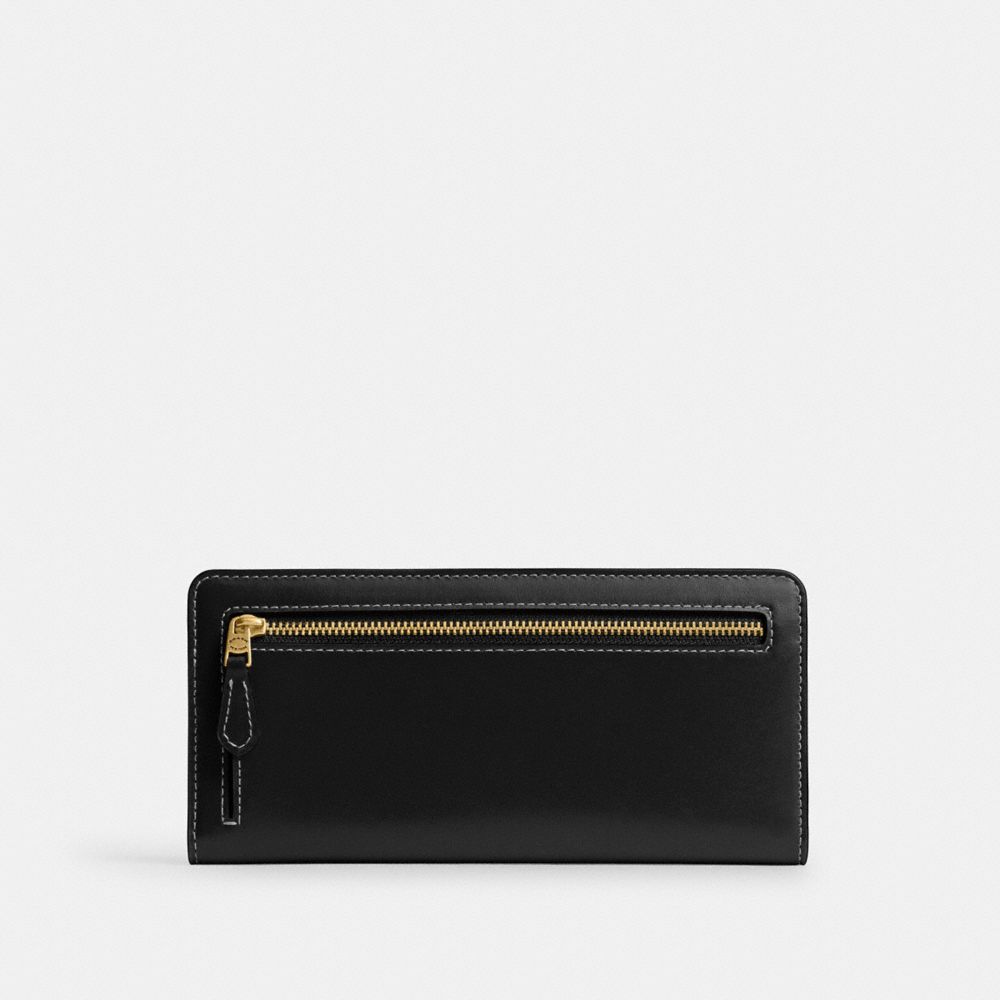 Crafted of refined leather detailed with our Signature hardware, the perfectly named Slim Wallet organizes essentials in a slender silhouette. Featuring an exterior zip pocket for coins, receipts, earbuds and other small essentials, the snap closure opens to reveal 12 card slots and multiple full-length bill compartments for easy organization.