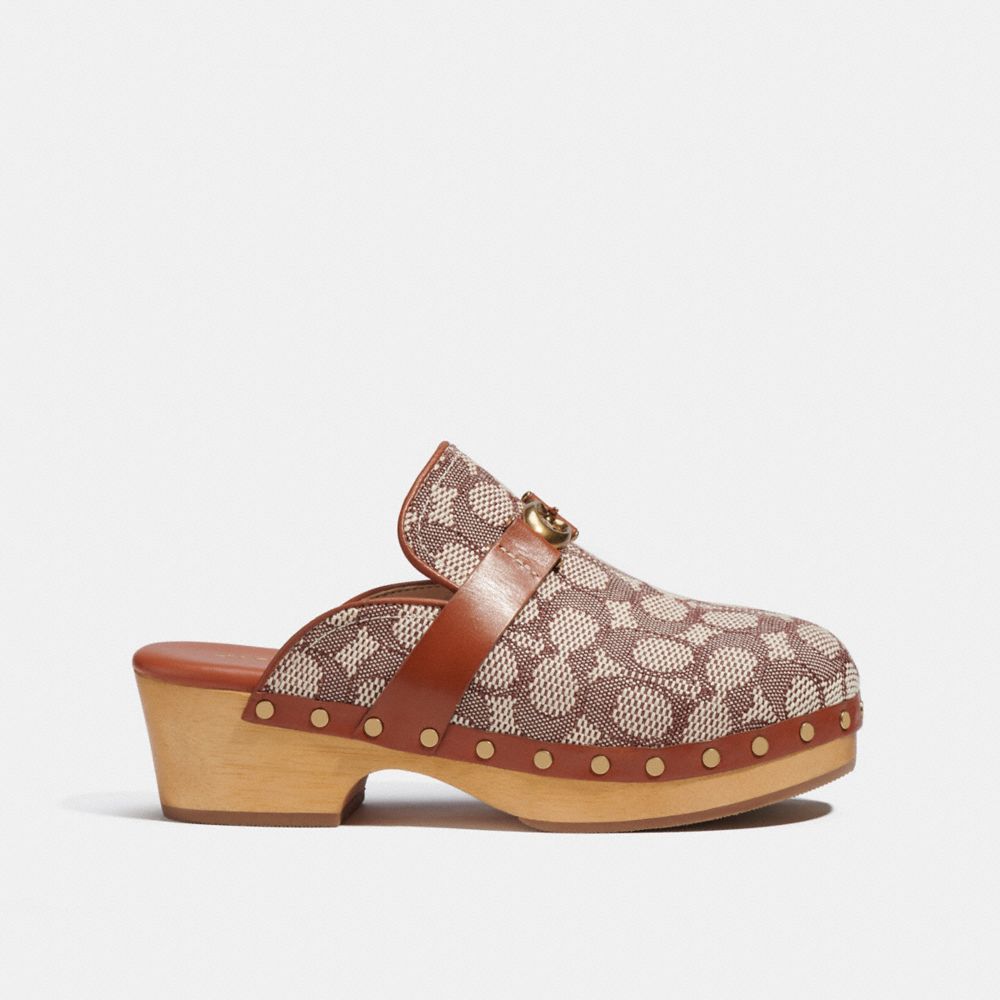 Inspired by our commitment to rethinking and reducing our impact on the planet, this Finlay clog is crafted of our Signature jacquard, a material lovingly created with a blend of organic cotton and recycled polyester. Featuring polished rivets and our Signature hardware for a heritage touch, the classic retro-cool style is set on a sturdy wooden platform with a rubber sole for added traction.