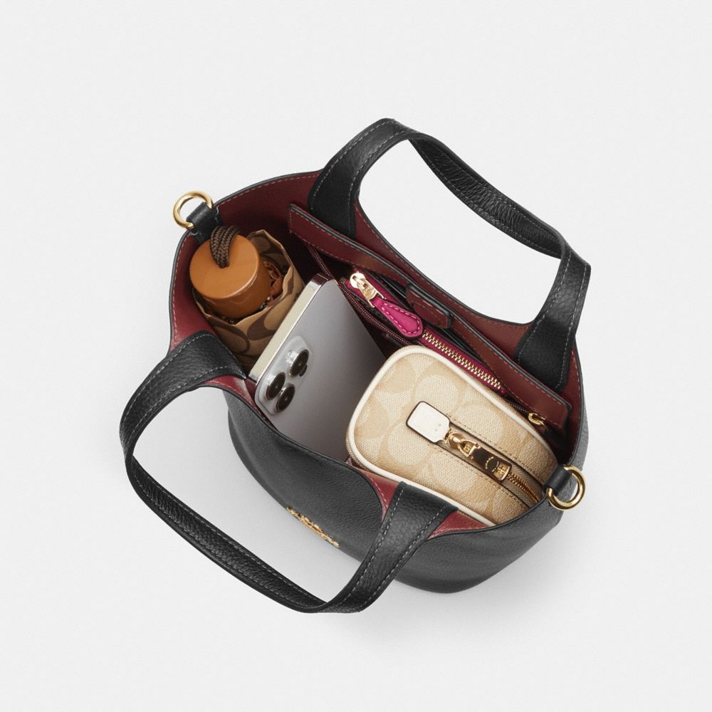 Splash. Our Hanna bag is a perfect bucket. Crafted of canvas and finished with refined calf leather, Hanna is a bucket bag designed with style and versatility in mind, with room for your wallet, phone and other essentials. This canvas shoulder bag travels well and is easily worn crossbody or carried by its handles. Its secure magnetic snap closure makes opening and closing it, well, a snap. Looking for effortlessly elegant women's shoulder bags? Hanna has it all.