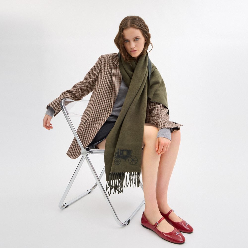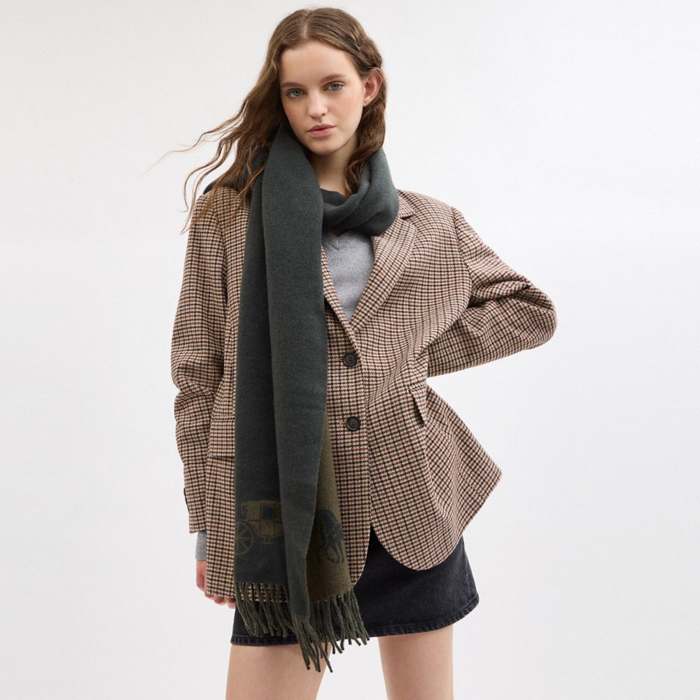 The Horse and Carriage Double Face Oversized Muffler is crafted of wool that's soft to the touch and features an iconic Coach motif. It has double the styling opportunities with its double-faced design. Wrap this designer oversized muffler around your neck to shield you from the chill or drape it over your shoulders for a more relaxed look.