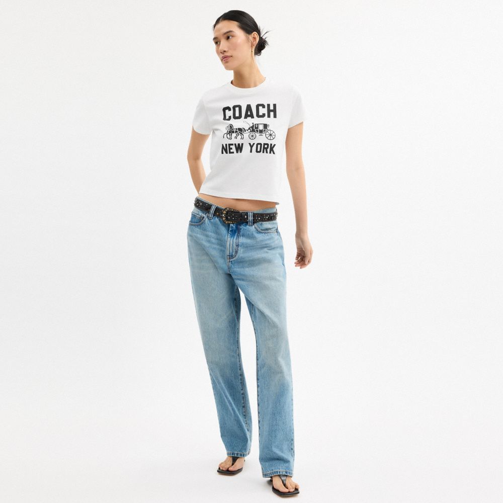 Crafted of organic cotton made without the use of harmful chemicals or fertilizers, this ‘90s-fit T-shirt is printed with a Coach graphic featuring our iconic Horse and Carriage motif. It’s finished with a ribbed crew neckline.