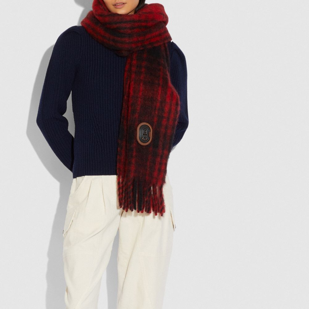 This oversized, warm scarf features a bright quintessential plaid and is great for bundling up. It’s finished with our Coach retro patch and delicate fringe trim.