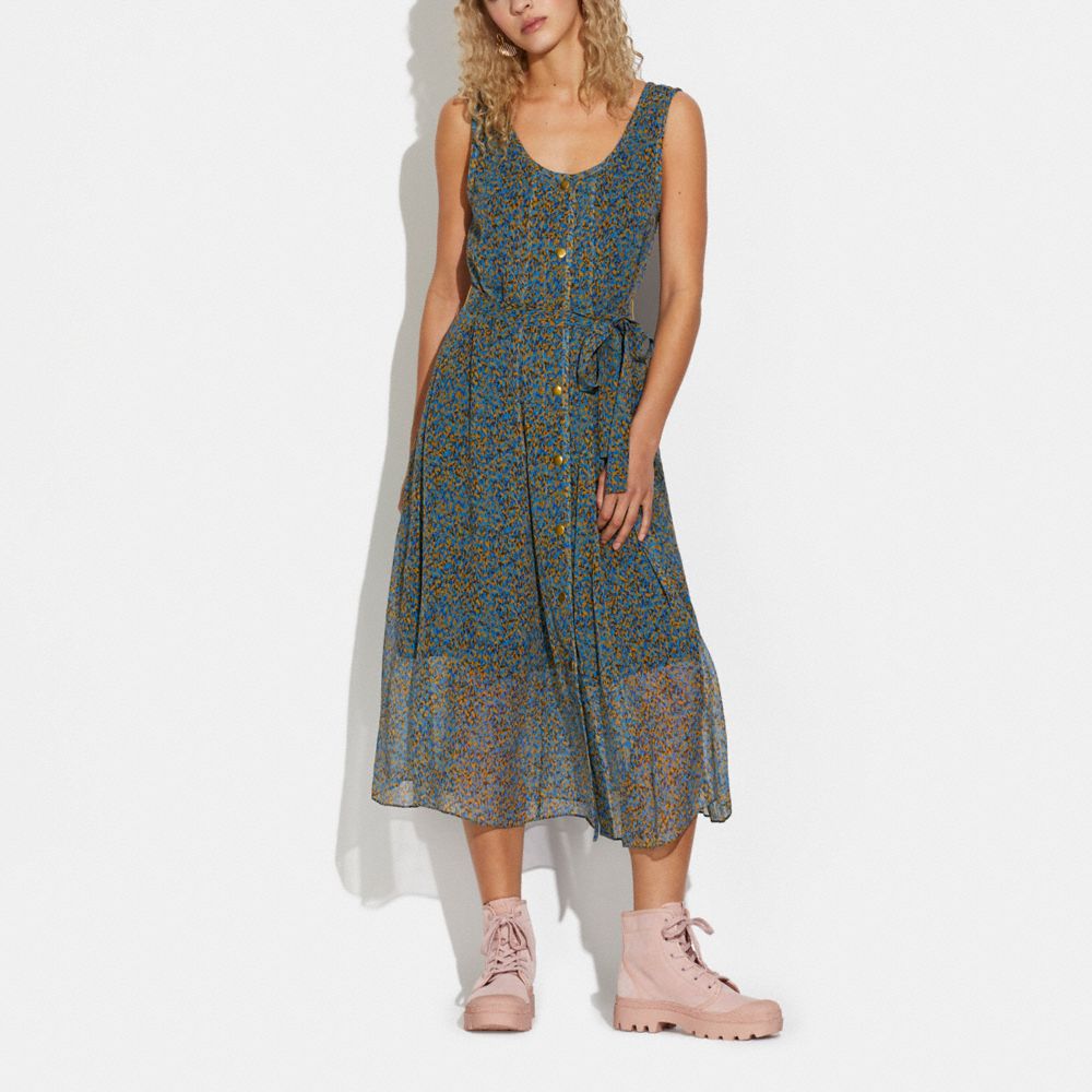Slip into something comfortable with this breezy silk dress. Detailed with a painterly dot print inspired by Coach’s first head designer, Bonnie Cashin, it features a solid slip, tie at the waist and an easy A-line silhouette.