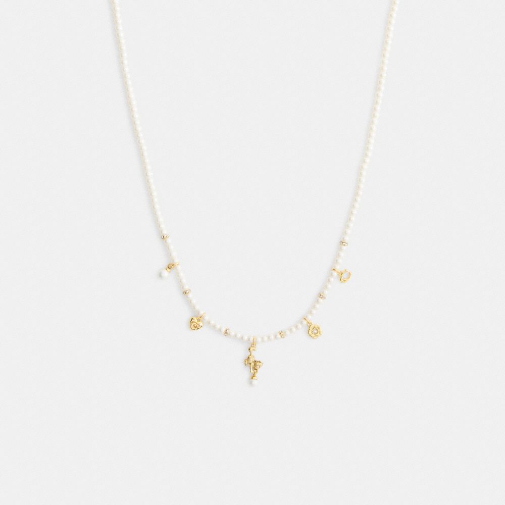 Strung with delicate glass pearls, this necklace features a playful kitten charm set amidst an array of our iconic Coach motifs. Accented with sparkling crystals, it’s finished with an adjustable clasp closure.