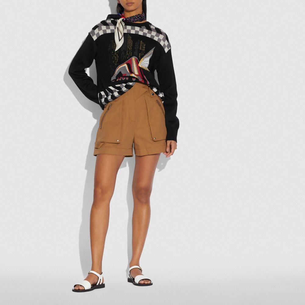 Capture the unstoppable energy of the city we’ve always called home with this intarsia knit sweater featuring a thundering subway train rushing past a shining New York City skyline. The classic-fit design is finished with graphic checkerboard trim inspired by retro taxi cabs.