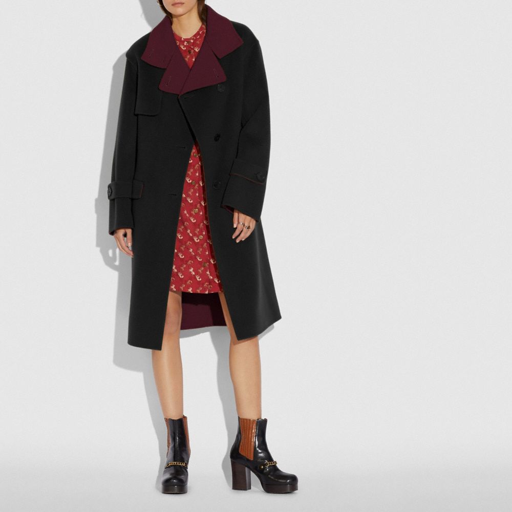 This luxurious, relaxed-fit coat is crafted of lightweight, double-faced wool, a smooth fabric where every seam is stitched by hand for a perfectly finished look. Finished with a protective storm flap and waist-defining self-tie, it’s finished with a contrast interior for a colorblock effect.