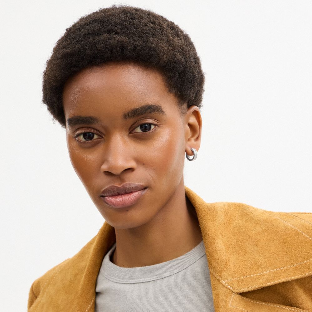 A dazzling pick for day or night, these huggie hoop earrings sparkle with pavé crystals. They’re finished with a hypoallergenic titanium post and an easy click closure.