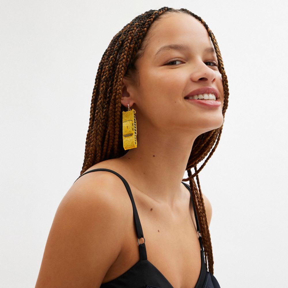 Taxi! A shout out to New York, the city we’ve always called home, this bright resin yellow cab earring sparkles with pavé crystals. The hoop is finished with a round clutch closure.