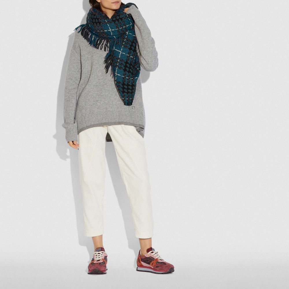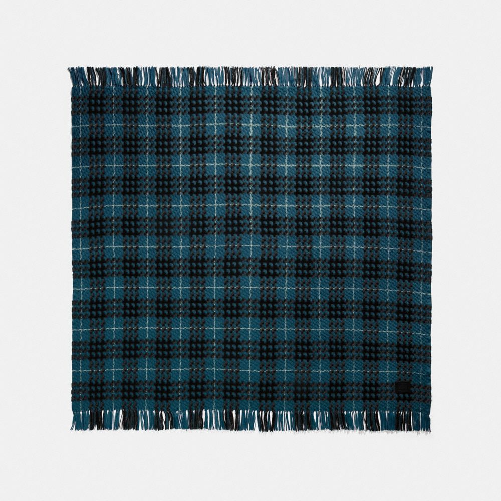 This richly-textured wool scarf features a bold windowpane plaid. The oversized style is finished with delicate fringe trim.