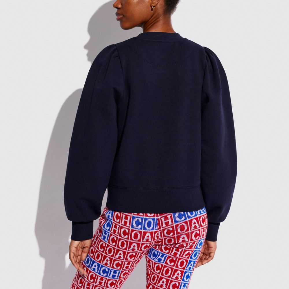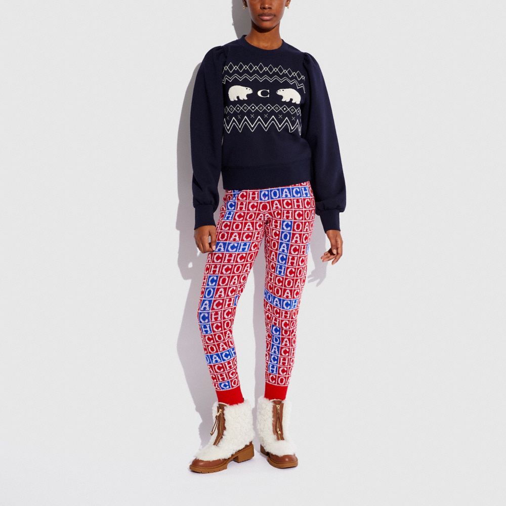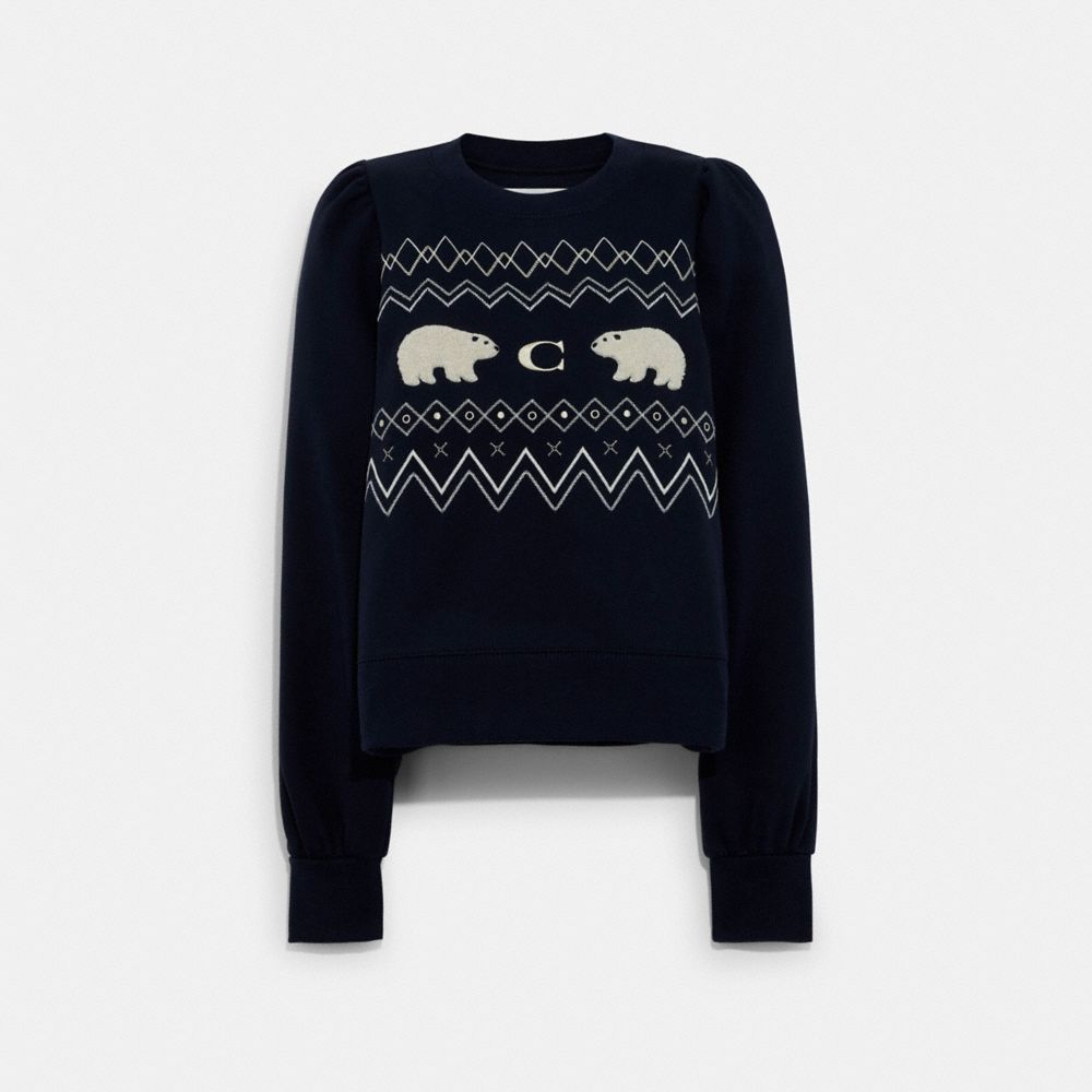 Crafted of fabric made with organic cotton and recycled polyester, this sweatshirt is part of Coach Forever, a collection inspired by our commitment to rethinking and reducing our impact on the planet. Featuring a classic winter fair isle pattern with a pair of cute polar bears and our Signature, the cozy-chic crewneck is finished with voluminous puff sleeves and banded trim.