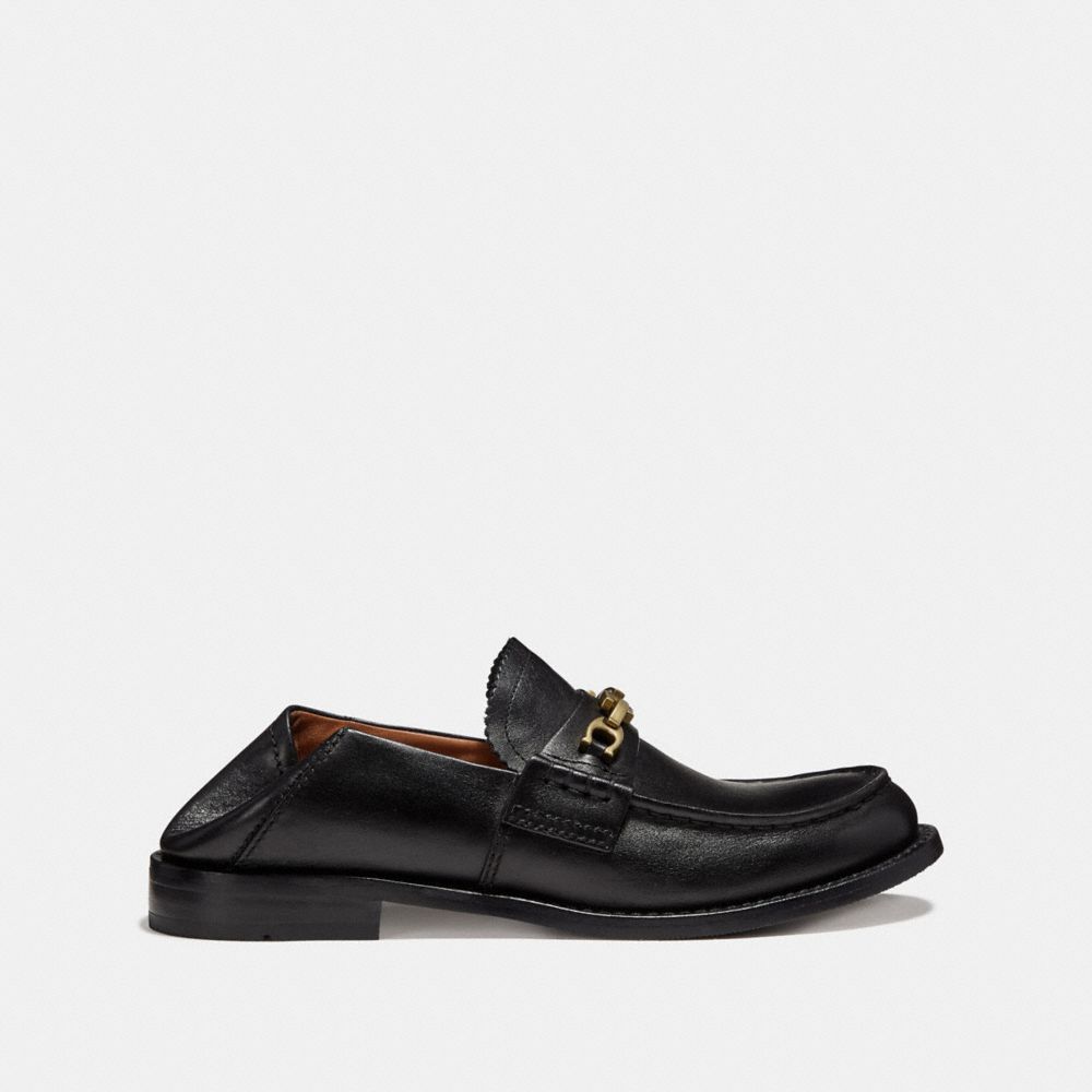 An update of a prep staple, this versatile leather women's shoe is designed with a fold-down heel to be worn as both a loafer and a mule. Signature Chain hardware adds shine and an iconic Coach look.