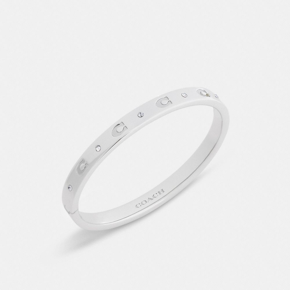 Subtly set with crystals, this polished hinged bangle features our Signature for iconic Coach style. Wear it alone or stack it with other bracelets.