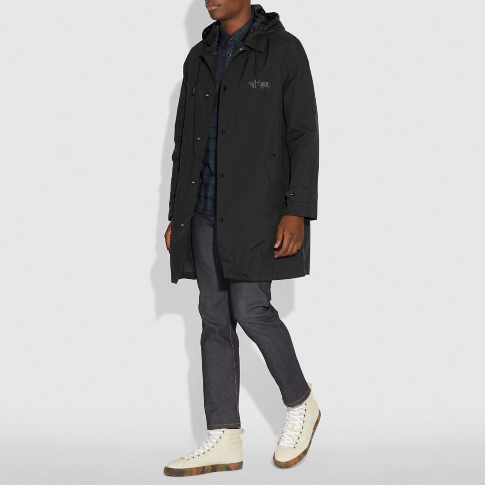This versatile design can be worn three ways: with the coat and windbreaker together, as a coat or as a windbreaker. The traditional silhouette is crafted in lightweight, water-resistant nylon and is finished with a playful twist of our Horse and Carriage icon featuring mascot Rexy.