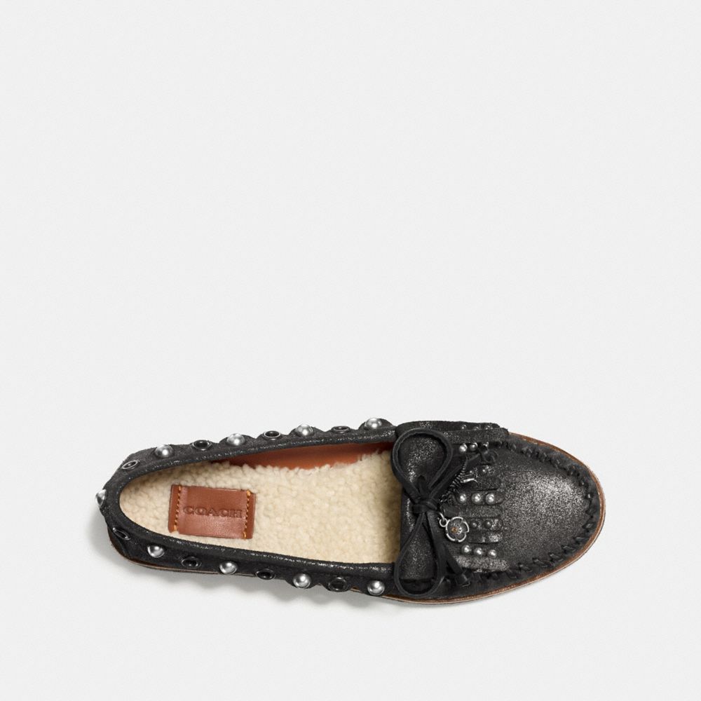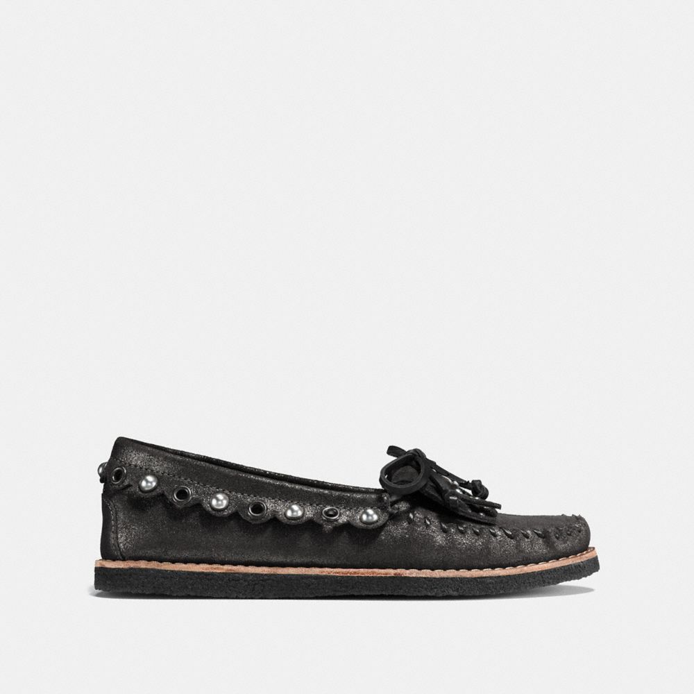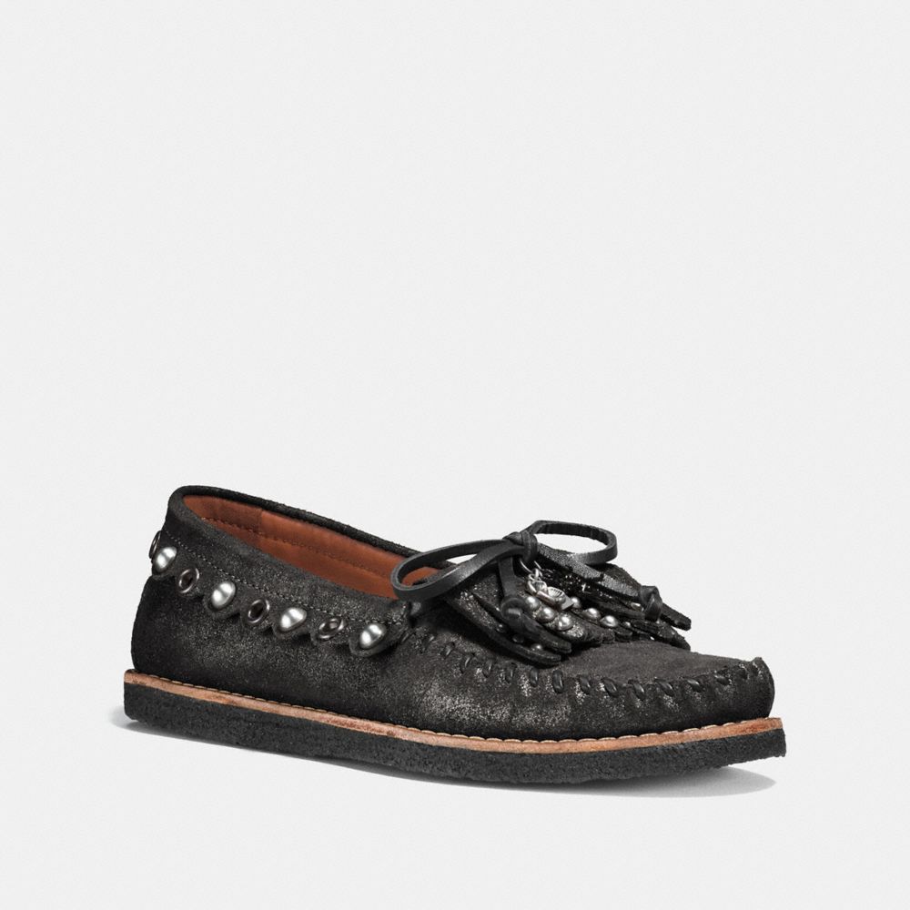 Pearly cabochons, metal rivets and Western-inspired fringe update our Roccasin slip on. The cushiony, smooth suede flat has a soft shearling insole and a leather bow with dangling Coach charms: a mini Rexy, a Tea Rose motif, and a signature hangtag.