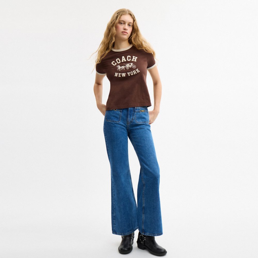 Featuring our sculpted Signature C hardware for heritage style, these denim pants feature patch pockets front and back. The slightly flared-cut jeans are finished with a leather Coach patch at the waistline.