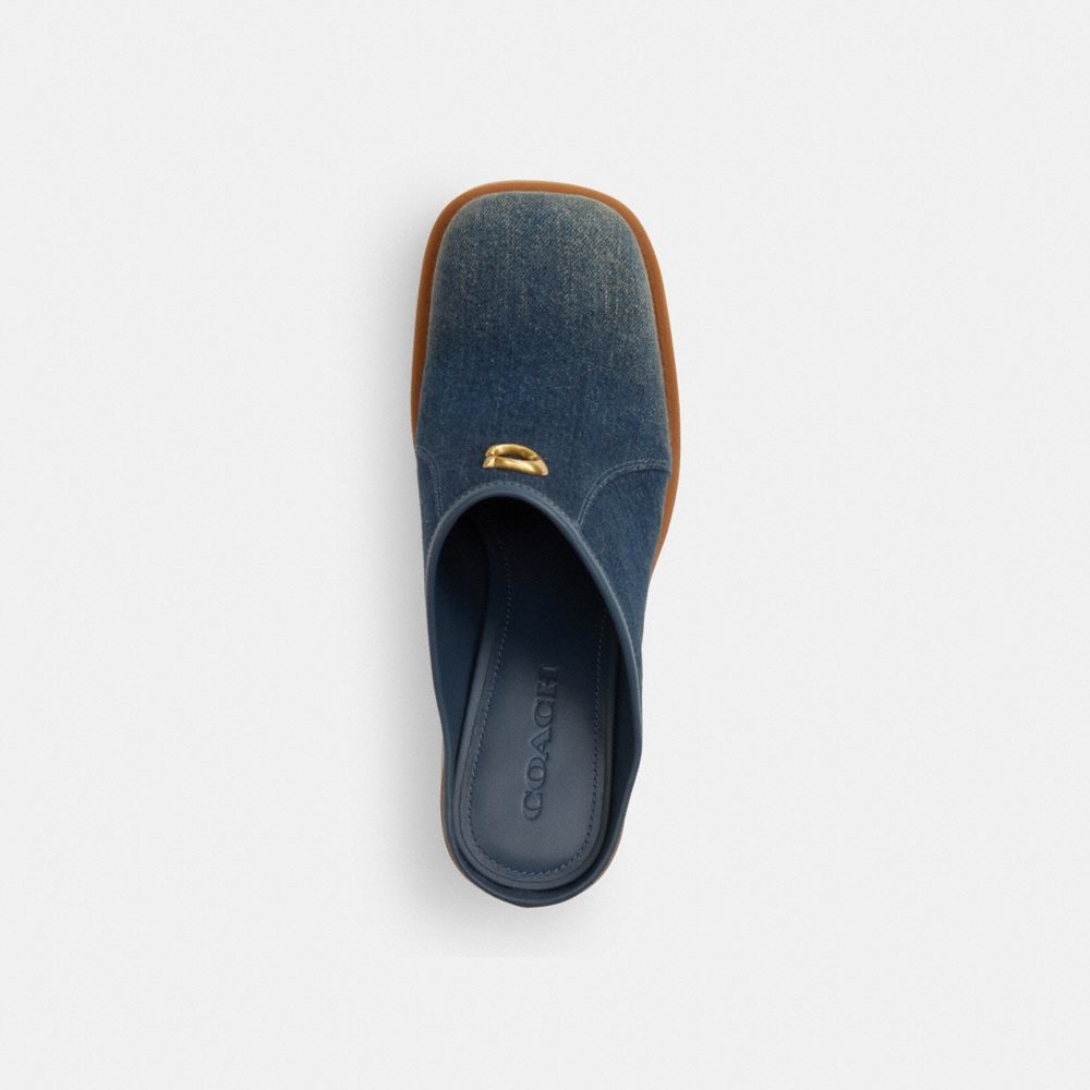 COACH®,Sculpted C Heeled Mule In Loved Denim,Denim,Leather,Rubber,Clogs,Mules,Logo,Metal,Day Party,Navy,Inside View,Top View