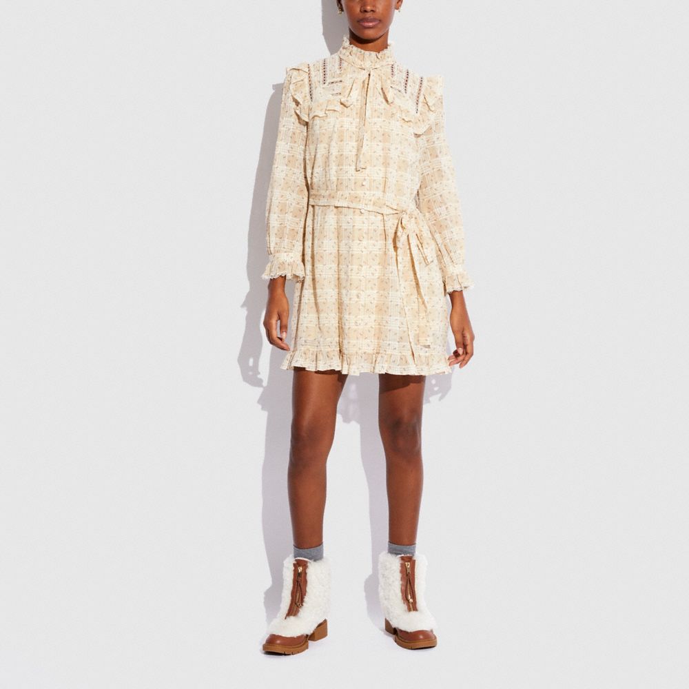 Play with patterns, this dotted plaid cotton dress is a day-to-night design loaded with feminine ruffles and lace trim. Featuring a long neck tie to wear undone, as a relaxed knot or a voluminous bow, the A-line style is finished with convenient on-seam pockets and a removable belt.