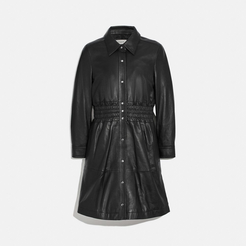 Rethink a wardrobe staple with our shirtdress crafted of buttery soft leather. Fully lined, it features polished snaps and embroidered smocking at the waist for the perfect fit.