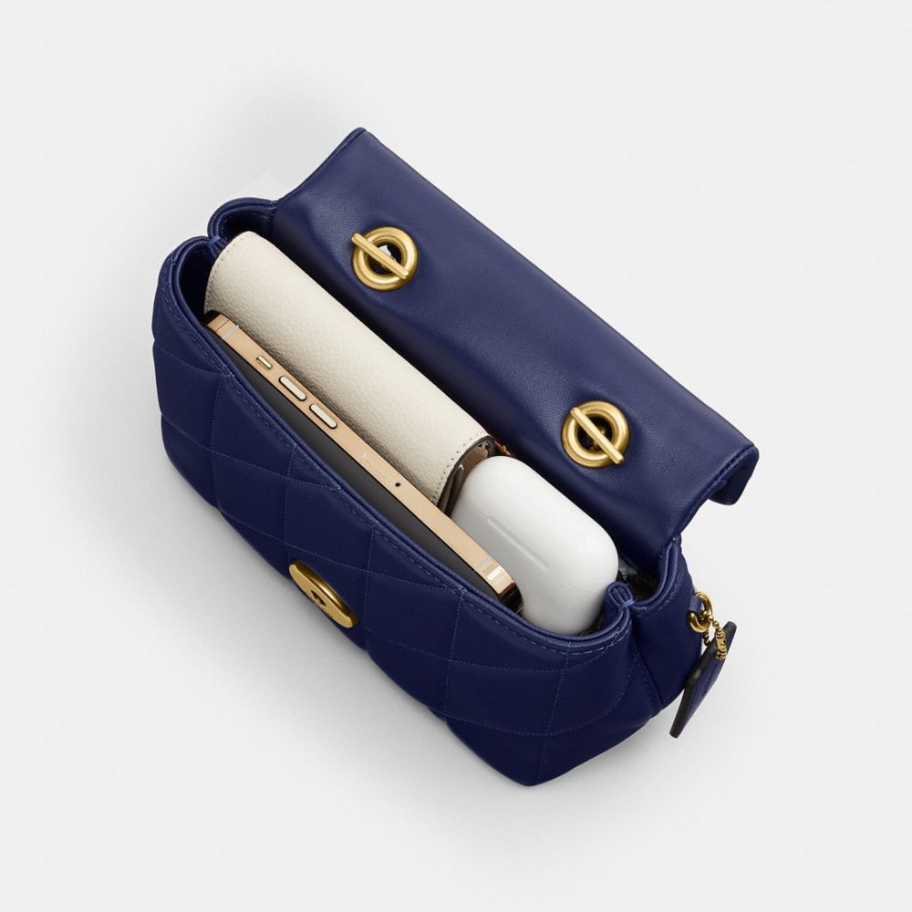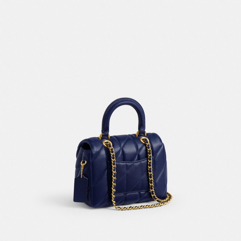 A modern take on an archival 1970s Coach design, our structured Tabby Top Handle Bag is crafted of quilted nappa leather and finished with our luggage top handle. Detailed with our Signature hardware sparkling with pavé accents, the feminine silhouette has a convenient outside pocket for easy access to essentials and a detachable gleaming chain strap to wear on the shoulder or crossbody.