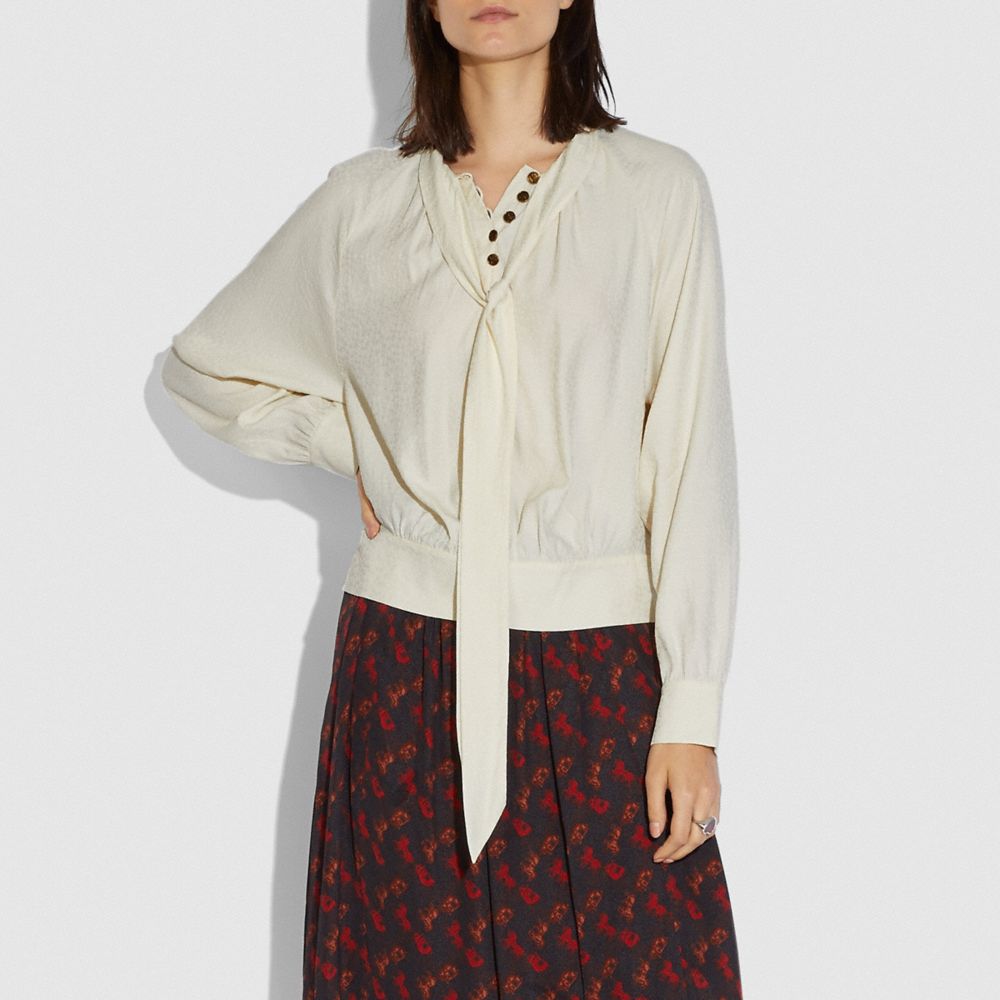 Gathered stitching, blouson sleeves and a fitted waistband hem add a relaxed drape to this textured jacquard blouse. Wear the long neck tie undone, as a relaxed knot or a voluminous bow.