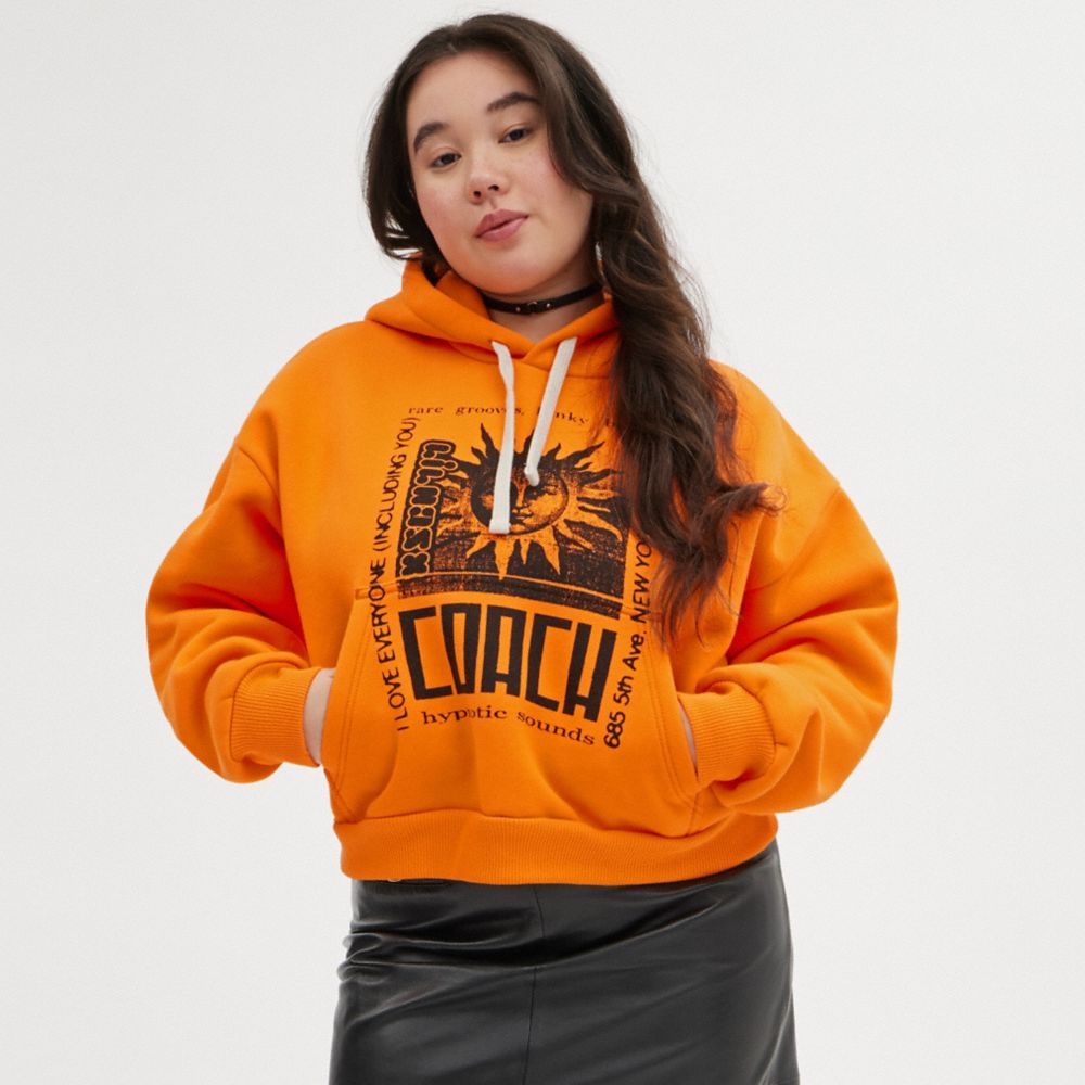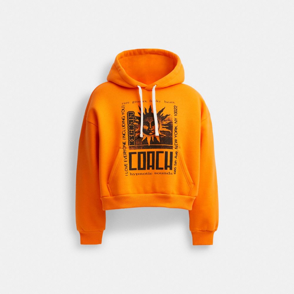 Presenting the Lil Nas X Drop, an edit designed by Coach and curated by Coach Ambassador Lil Nas X, celebrating his unique and expressive approach to style. This soft shrunken-fit cotton-blend sweatshirt features a playful graphic inspired by ‘90s underground rave posters. The drawstring hoodie is finished with a kangaroo pocket and ribbed trim.