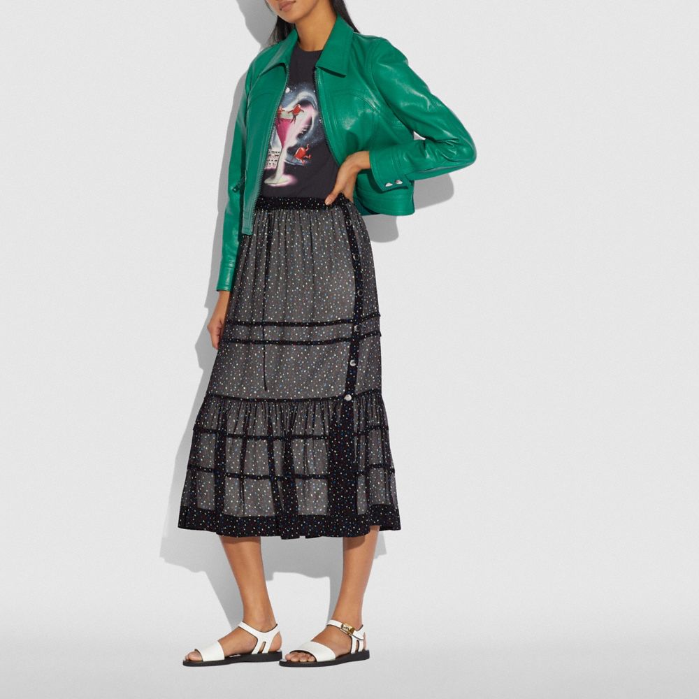 Add playful movement to every step, our A-line silk midi skirt has a gathered tiered hem and a lightweight, breezy feel. Featuring a painterly dot print, it's finished with a drawstring waist and polished side snaps.