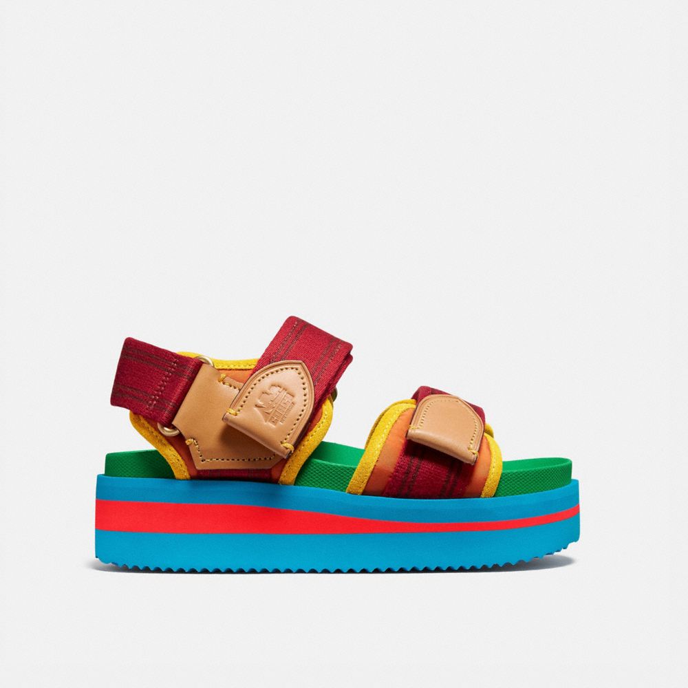 Our sporty, adventure-ready Trail Sandal features a gently raised platform and a no-slip rubber sole for all-day comfort. Crafted of lightweight striped webbing and smooth leather featuring our Coach Camp patch, it’s finished with Velcro closures for on-and-off ease and a customized fit.