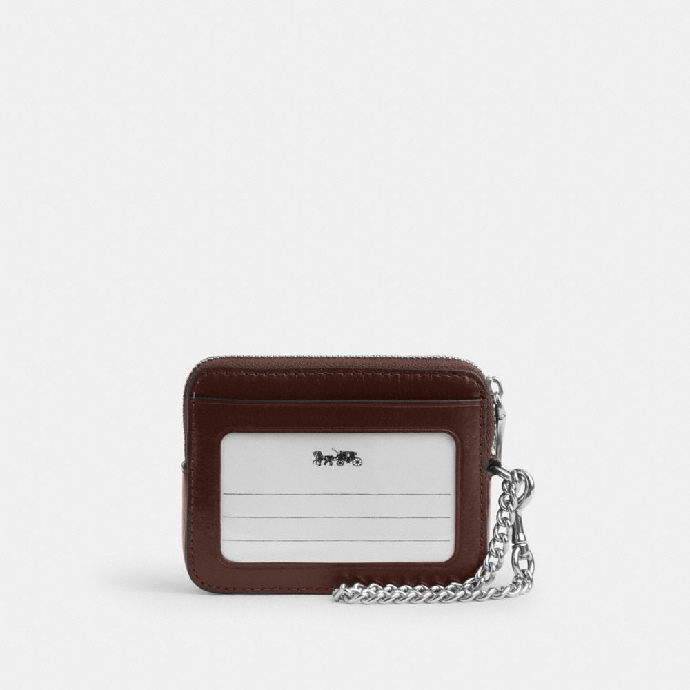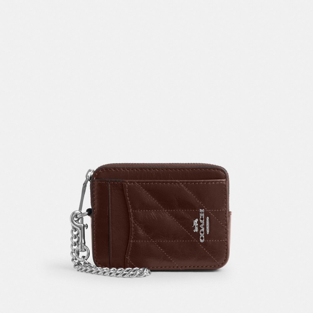 The Zip Card Case works well for everyday use. Crafted of glazed leather, this quilted style has two credit card slots, an ID window, an open pocket and a zip compartment for easy organization. A chain wrist strap with dogleash clip offers hands-free convenience.