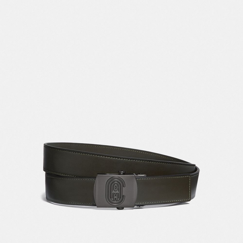 Coach's designer men's belts are more than just accessories—they are versatile style companions that enhance any outfit for any occasion. One of our most popular pieces is the Signature Buckle Cut-to-Size Reversible Belt. Featuring our iconic Signature buckle, this belt offers two looks in one: our Signature canvas on one side and refined leather on the reverse. Adjustable to your ideal fit, you can easily trim it at home with a pair of scissors following straightforward instructions.
