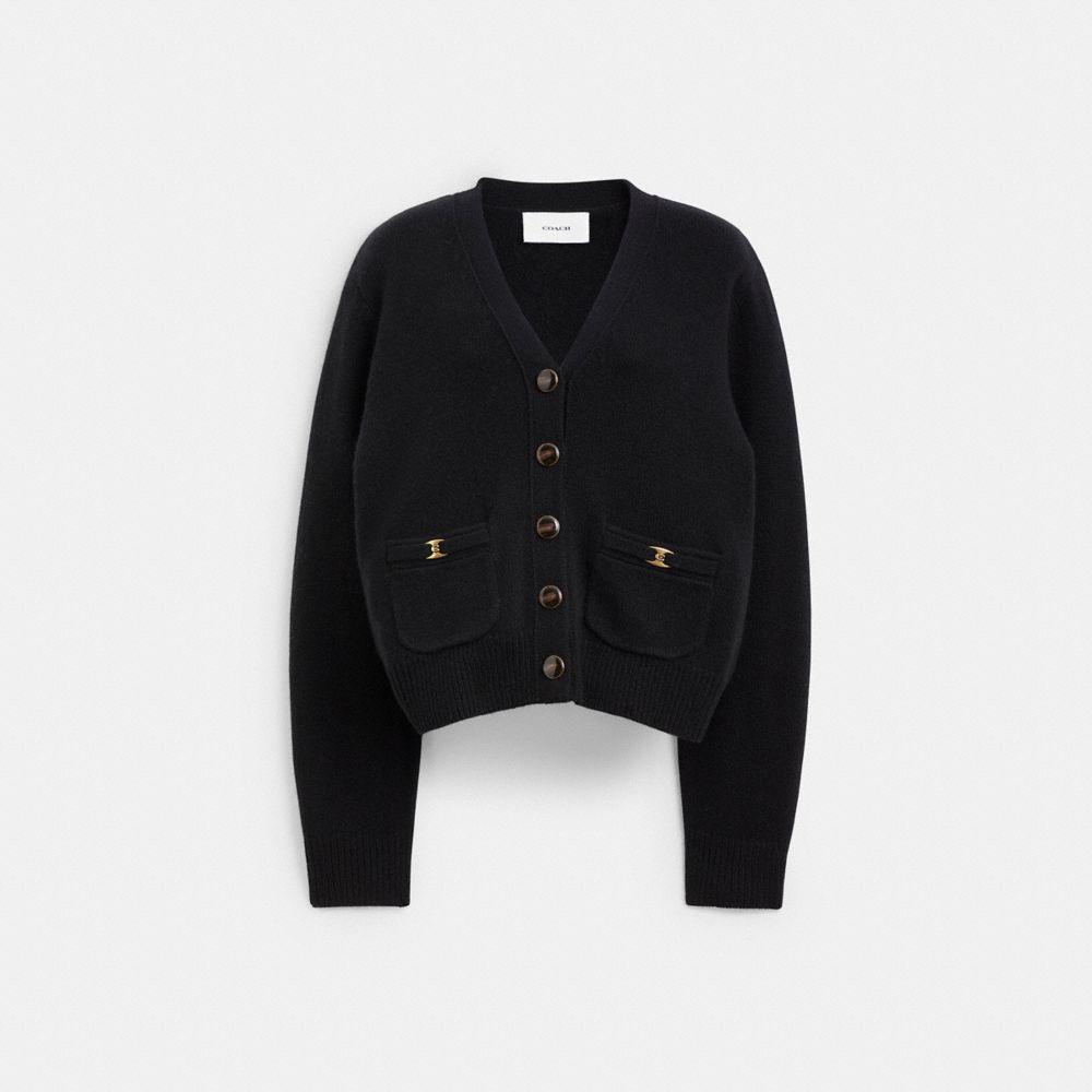 COACH®,Heritage C Cardigan,Cardigan,Mesh Insets,Logo,Work,Black,Front View